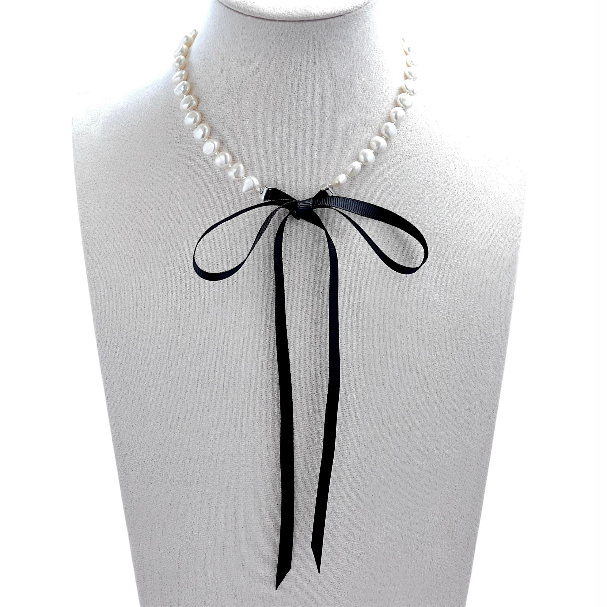 個性的なバロックパールをあえて使用することで、可愛らしい印象が強くなりがちなパールとリボンの組み合わせに適度なカジュアルさを加え、甘さを中和。大人の女性が自信を持って楽しめる、洗練されたクラシックモダンなスタイルを実現しました。首元を華やかに、そして知的に彩ります。
